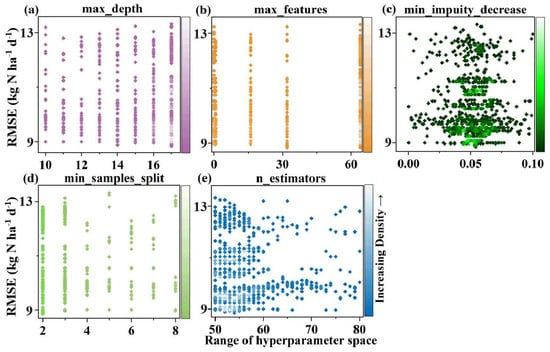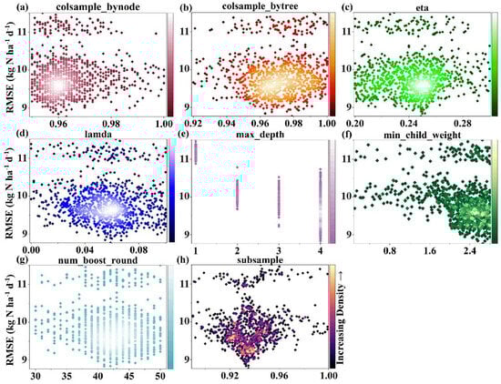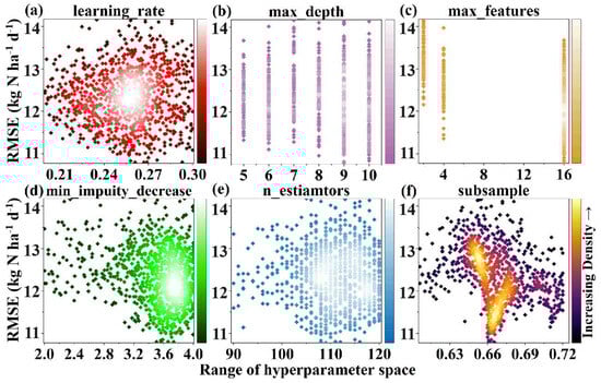 Figure 5, Figure 6 and Figure 7 show the sampling point iteration trend of GBDT, RF, and XGB models in the TPE optimization process, respectively. Obviously, the sampling points in the TPE optimization process have an aggregation trend, and there is a region with the densest distribution of sampling points in each hyperparameter iteration process. For example, some hyperparameters (min_impuity_decrease of the GBDT model and min_child_weight of the XGB model) increase with the increase in the value, and the distribution of sampling points change from sparse to dense. Other hyperparameters (n_estimators of the RF model and colsample_bynode of the XGB model) show the trend of sampling points from dense to sparse (that is, it is difficult to reach the optimal value, even if the hyperparameter value is increased). These sampling-intensive areas are significantly different from the sparse sampling areas, and the optimal parameters often appear near the sampling-intensive areas. The lowest RMSE values obtained by the RF, GBDT, and XGB models in the TPE optimization process are relatively close, which are 11.96 kg N ha−1 d−1, 11.77 kg N ha−1 d−1, and 11.70 kg N ha−1 d−1, respectively, indicating that the TPE algorithm has strong generalization in the hyperparameter optimization of different models. TPE always selects the next set of sampling points according to the results of previous sampling points []. After multiple iterations, the probability that the optimal hyperparameters appear in the dense sampling area is much higher than in the sparse area.