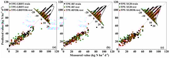 As shown in Table 5, the combined prediction accuracy of the TPE–ML–OK method was higher than that of the monotonic machine learning model, and the three integration models characterized more than 75% of the spatial variability (R2) of soil NH3 fluxes. Moreover, the test set scattering points of the three integration models were more compactly distributed near the diagonal, and their residuals were closer to normal distribution and concentrated in the low-value region (Figure 8). The TPE–XGB–OK model exhibited the highest prediction accuracy (i.e., RMSE = 6.42 kg N ha−1 d−1, and R2 = 85.97%) in comparison with the other models, which indicated that the TPE–XGB–OK model could explain the linear and nonlinear relationships between soil NH3 and environmental variables. The above results exhibited that the ML models assisted by the TPE algorithm have a more uniform distribution of residuals with fewer extremes, and the smoothing effect of residual kriging interpolation promotes the higher prediction accuracy of the TPE–ML–OK method.