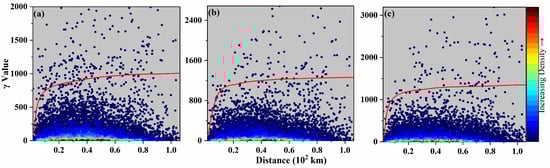 Cumulative semivariograms of residual points of (a) TPE–GBDT, (b) TPE–RF, and (c) TPE–XGB models.
