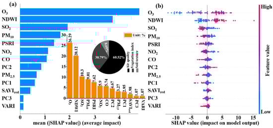 The SHAP analysis: (a) a standard bar chart obtained using the absolute value of the mean SHAP values of each variable, and (b) the SHAP values of the environmental variable in each sampling point using the TPE–XGB model. The SHAP value is higher than 0, which means that the variable responds to a positive influence on the soil NH3; otherwise, it has a negative influence.