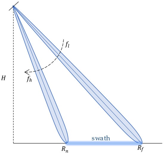 where is the effective bandwidth of the echo, is the total bandwidth of the transmitted chirp signal, is the 3-dB width of the pencil beam, and and are the look angles at the far end and near end of the swath, respectively. The reduced effective bandwidth results in poorer resolution in the range direction, so it is necessary to transmit a broadband chirp signal or increase the width of the pencil beam to improve the resolution. In addition, Doppler parameters can no longer be calculated at a single wavelength because different range targets receive different sections of the transmitted chirp signal, resulting in varying center frequencies and wavelengths for different target echoes.