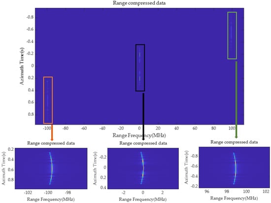 Range compression is accomplished by performing a range Fourier transform on the signal data after the dechirp operation. Echoes from different range cells have linear terms with unequal slopes, corresponding to different shifts in the frequency domain. Therefore, after the range Fourier transform, echoes are focused at various positions on the range–frequency axis. The compressed echoes are successfully distinguished. Additionally, there is a large enough bandwidth in the frequency domain to avoid range aliasing. The signal data in the range-frequency domain is: