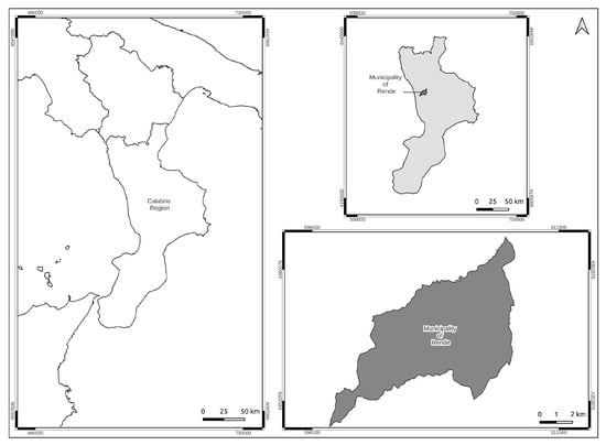 The proposed method is tested on an urban area in southern Italy: the municipality of Rende (Figure 1). Rende covers a surface of 55 km2 and has a population of 36,123 inhabitants. Rende is characterized by different settlement areas, such as Roges, Commenda, Quattromiglia, Arcavacata-Santo Stefano, Saporito, and Surdo.