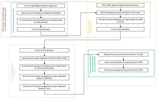 First, the orthoimages referred to 2000 and S-2 satellite images for 2022 are processed employing the experimental AI platform, which combines Deep Learning (DL) technologies to classify and segment building heritage from satellite and orthoimages, with GIS techniques to import, use, and process its output to analyze the urban growth over time [,].