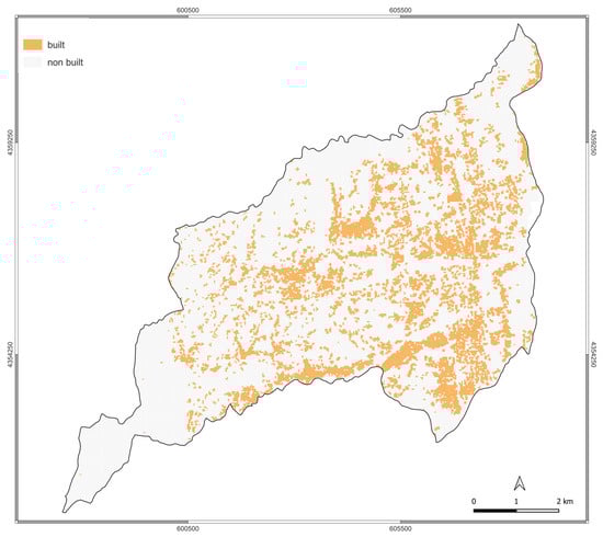 The AI platform is employed to detect the built-up coverage in 2000 and 2022. The output of the DL model is imported into the GIS environment, which, in this case, coincides with the open-source QGIS software [], obtaining an initial classification and segmentation of the built-up area cover changes in the 2000–2022 period. The accuracy of this first attempt to identify the built-up area cover is assessed by comparing the classification and segmentation obtained for 2022 with the information on land use land cover available from the DBSN. The accuracy level of the classification and segmentation through the AI platform is demonstrated through the F1-Score.