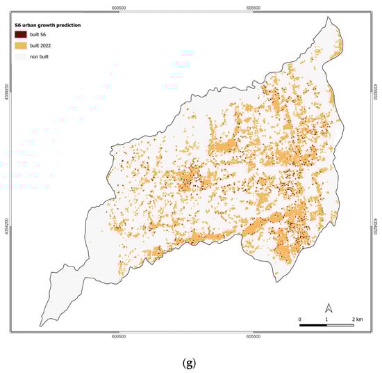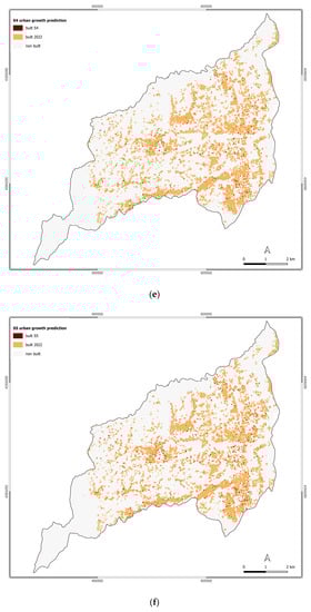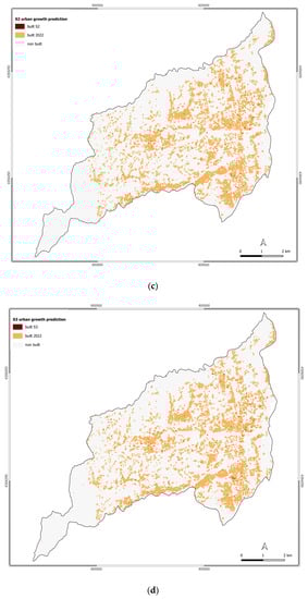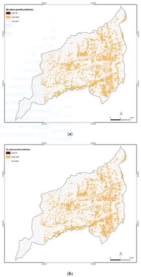 Before applying the BLRM to simulate future urban growth scenarios, the authors assessed the accuracy prediction of the single averaged BLRM. The built-up area distribution for 2022 is predicted by applying the single averaged BLRM considering the driving factors value for the 2022 reference period. The accuracy of the single averaged BLRM is evaluated through Cohen’s Kappa coefficient by comparing the 2022 built-up area map obtained from the two-step semi-automatic procedure described in Section 3.2, with the built-up area simulated by the single averaged BLRM. The Kappa coefficient is selected to measure the prediction accuracy as it considers the possibility of the agreement due to chance [].
