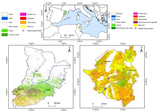 Two areas, characterized by a Mediterranean climate and different agricultural practices (rainfed, irrigated, or support irrigated crops), are studied: Lleida in Catalonia (Spain) and Kairouan in Tunisia. In this study, we refer to the agriculture year as a year beginning in September of the previous year and ending in August of the following year.