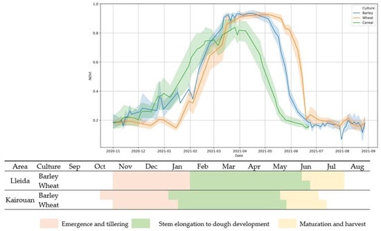 Given the distinct agricultural practices and varied climatic conditions between the two study areas, Figure 2 shows the phenological cycles of wheat and barley, where notable differences are observed. In both study areas, wheat is sown from early November to late December in Lleida and 20 January in Kairouan. Barley, on the other hand, is sown between early November to late December in Lleida and mid-January in Kairouan. During the tillering phase, temperature plays a crucial role in accelerating the development of cereals. In the Kairouan study area, favorable temperature conditions facilitate their growth. On the other hand, in Lleida, low temperatures during December and January lead cereals to enter dormancy until they accumulate enough degree joules to resume development, resulting in a lengthened cycle. In Kairouan, farmers irrigate throughout the cereal cycle with a rotation of around 10 to 15 days, depending on the size of the field. The maximum vegetative development of cereals is reached between mid-March and mid-April. In contrast, the peak vegetative development in Lleida is observed from the end of March to early May for barley and from early April to late May for wheat. The maturation stage is reached by the end of May in Kairouan; in Lleida, this stage occurs by the end of June to mid-July.