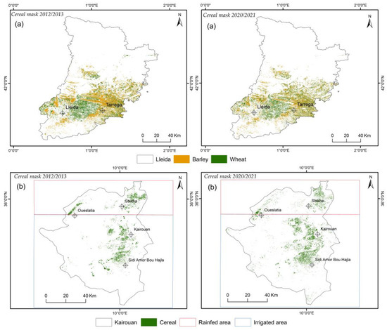 Cereal mask for the provinces of (a) Lleida and (b) Kairouan for two agricultural years (2012/2013 and 2020/2021).