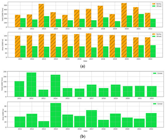 The yield data of the Kairouan governorate are taken from the Minister of Agriculture, Hydraulic Resources, and Maritime Fishing of Tunisia. These estimates are obtained by sampling crops using 1 m × 1 m frames. By taking two samples per field, the total cereal samples can exceed 3150 for the whole country. Cereal grain weight is measured separately for each governorate to obtain the average productivity for the entire governorate. An estimate of total production is then deduced from the area occupied by cereals. Figure 4b illustrates the variation in cereal production and cultivated area in the governorate of Kairouan, which encompasses both barley and wheat classes. Notably, the highest recorded cereal production occurred in the agricultural year 2011/2012 (241,400 tons).