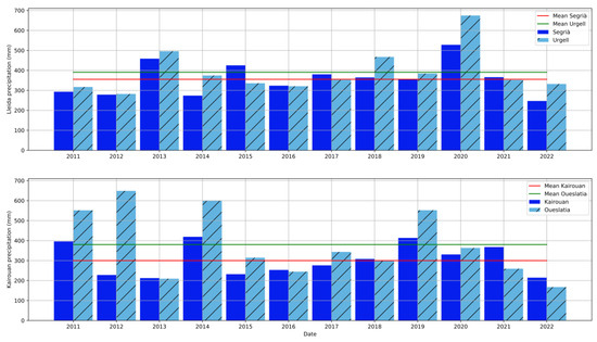 Figure 5 below shows annual precipitation data from the Segrià and Urgell stations in Lleida and the Kairouan and Oueslatia stations in Kairouan. The annual precipitation is computed for each agricultural year independently, encompassing a period from September of one year to August of the following year (e.g., annual precipitation for 2011 is derived from September 2010 to August 2011). Figure 5 includes lines with the mean precipitation values during the study period for the respective stations.