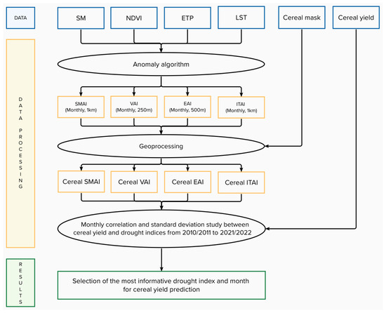 Meteorological drought indices are based mainly on precipitation and temperature, such as the Standardized Precipitation Index [33] and the Palmer Drought Severity Index [34], which can be a constraint for countries that do not have a very dense network of stations. Remote sensing allows repetitive coverage of very large areas and thus has become a crucial tool in the study of the spatiotemporal evolution of drought in remote or insufficiently monitored areas [35]. Surface and plant temperature remote sensing data have been widely investigated in several studies for detecting drought periods and assessing crop yields [36,37,38,39,40,41,42]. Among the established indices, the Temperature Anomaly Index (TAI) [43] has been largely used in the study of drought periods and their impact on yield in many regions, especially when a strong positive anomaly is recorded [40,44,45].