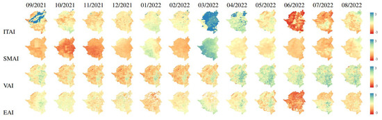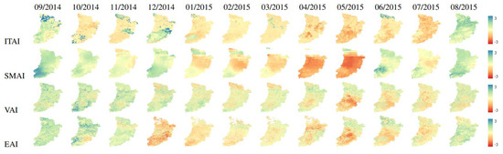 Drought indices (ITAI (1 km), SMAI (1 km), VAI (250 m), and EAI (500 m)) for Lleida province from September 2014 to August 2015.