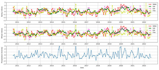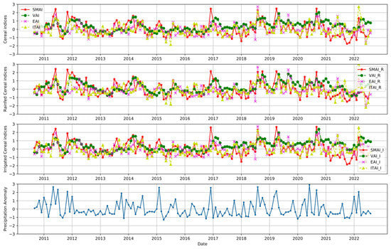 The averages of each drought index corresponding to cereal fields for each month were extracted to focus only on information relevant to the cereal sites. Drought periods were identified based on the severity and duration of SM deficits, vegetative stress, and prolonged high temperatures, with each condition lasting for a minimum of three consecutive months. For the Kairouan study area, a comparison between the performance of drought indices in relation to vegetative status and agricultural practices by comparing the average for all cereal drought indices, the average for predominantly rainfed cereals, and predominantly irrigated cereals was made.