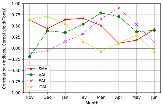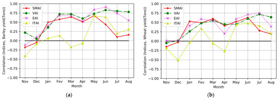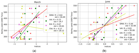 In order to select the drought indices most correlated with wheat and barley yield, Pearson’s correlation (R) and standard deviation (std) were calculated. R is among the most used correlation methods to study the relative strength of the linear relationship between two variables [104].