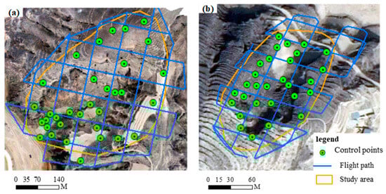 Schematics of the flight path, GCPs distribution, and the study area scope. (a) The T1 study area has 33 GCPs. (b) The T2 study area has 31 GCPs.