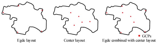 Besides the two indices to quantify the spatial pattern of GCPs, three patterns that edge layout, center layout, and edge combined with center layout (Figure 3) are used to validate the effect of the indices due to the obvious differences of the three layouts in the indices. Among the three layouts, the MEDCP of edge layout is the largest, followed by the edge combined with center layout, and the center layout. With a same layout (e.g., center layout), the CI varies with the GCP distribution. A larger CI can represent the discrete distribution of the convex hull of GCPs.