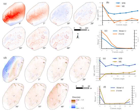 (a–c) are the error maps with different camera angles, STD and ME of error maps, and Moran’s I of error maps in the T1 area, respectively; (d–f) are the error maps with different camera angles, STD and ME of error maps, and Moran’s I of error maps in the T2 area, respectively.
