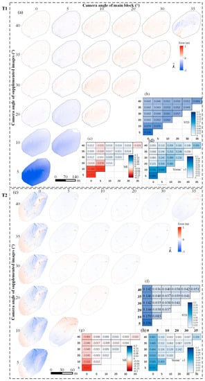(a–d) are the error maps with different combinations of camera angles, STD, ME, and Moran’s I of the error maps in the T1 area, respectively; (e–h) are the error maps with different combinations of camera angles, STD, ME, and Moran’s I of the error maps in the T2 area, respectively.