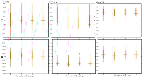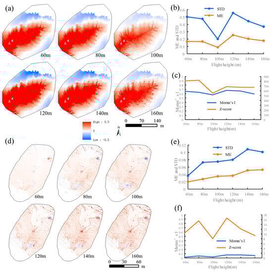(a–c) are the error maps with different flying height, STD and ME of error maps, and Moran’s I of error maps in the T1 area, respectively; (d–f) are the error maps with different flying height, STD and ME of error maps, and Moran’s I of error maps in the T2 area, respectively.
