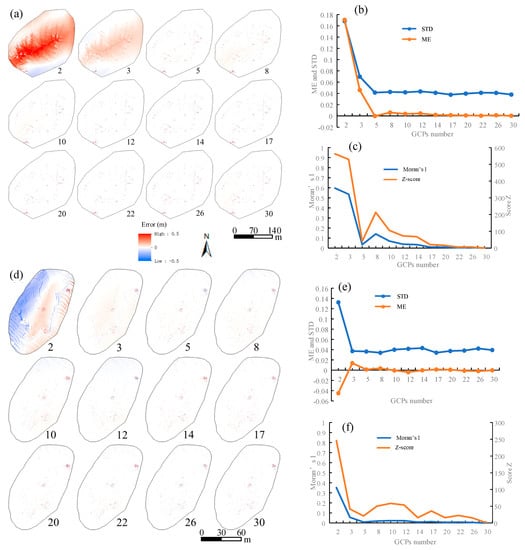 (a–c) are the error maps with different GCPs, STD and ME of error maps, and Moran’s I of error maps in the T1 area, respectively; (d–f) are the error maps with GCPs, STD and ME of error maps, and Moran’s I of error maps in the T2 area, respectively.
