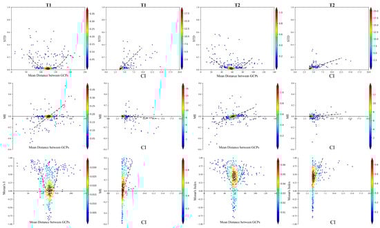 Figure 9 shows the effect of the spatial distribution of GCPs on ME, STD, and Moran’s I. The two study areas show the same trend. The closer the MEDCP is to the average distance of the study areas (about 125 m and 60 m for the T1 and T2 area, respectively), the smaller the STD is, and the closer to zero ME and Moran’s I are. This means that the even distribution of GCPs is better for improving both the magnitude and spatial structure of errors. Meanwhile, the results of CI show that the closer the convex hull area of GCPs is to a circle, the smaller the ME, STD, and Moran’s I. This implies that GCPs should be discretely distributed at the edge of the study area as much as possible, which could be more important than even distribution.