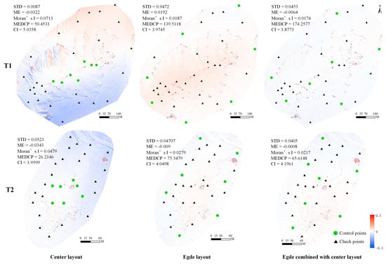 To validate the findings in Figure 9, the edge layout, center layout, and edge combined with the center layout are used to reveal the error maps with different GCP distributions. Figure 10 shows the error maps of the three layouts of GCPs. With the center layout, the MEDCP is the smallest among the three layouts. Obvious spatial autocorrelation exists in the error maps regardless of high or low CI value, indicating systematic errors to some extent. With the edge layout, the MEDCP is the largest among the three layouts. The spatial autocorrelation (Moran’s I) is reduced but still exists, especially in the central area. For the edge combined with the center layout, the MEDCP is the median among the three layouts. The spatial autocorrelation is optimized as much as possible; the ME, STD, and Moran’s I are the lowest. Notably, compared with the edge layout, the edge combined with the center layout only has a slight improvement although more GCPs were used; this suggests that the discrete distribution at the edge of the study area is more important than the even distribution of the whole area.