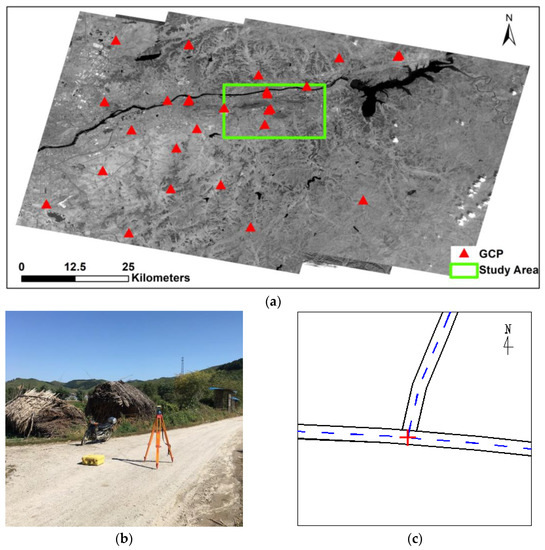 GCPs used in this study. (a) Distribution of GCPs on ZY-3 stereo images. The green rectangle represents the overlapping areas of the four sets of stereo images in the study area. The red triangles represent the locations of GCPs. (b) GCP measured though RTK in the center point of road intersections. (c) Locations of prick points for GCPs.