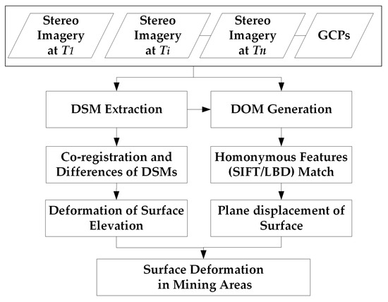 Surface deformation is retrieved from the difference of DSMs and the displacements of image homonymous features after co-registration. The difference of DSMs reflects the change of surface elevation in the region, while the displacements of homonymous features reflect the variation of surface deformation in the plane direction. The process of retrieving surface deformation by combining DSMs with the image homonymous features in the mining areas is shown in Figure 3.
