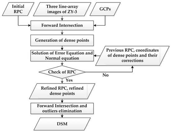 DSM is generated from the three line-array images of ZY-3 satellite using RFM as the imaging geometric model, which is an accurate fitting of the rigorous geometric imaging model. According to the RPC in the RFM, the relationship between the 2D image coordinates and 3D ground coordinates is defined as follows: