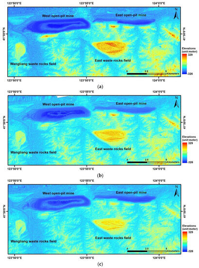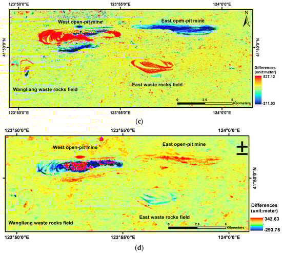 In the west open pit, it is mainly manifested as the elevation descending on the north slope and the south slope, which is caused by the slip of the north and south slopes between 2012 and 2017. As shown in Figure 8a, the yellow polygons in the west open pit show the slip regions, where the observed elevation is reduced by an average of 23.19 m, the area of the deformation is about 1.22 km2 and the ground volume change is about 3.15 × 107 m3. At the same time, the elevation also presents an uneven rise in the east–west direction in the open pit during this period, involving an area of about 5.18 km2 where elevation increases by an average of 34.95 m and there is a volume change of nearly 1.88 × 108 m3. However, the change between 2017 and 2022 in the west open pit is significantly different from the change between 2012 and 2017 due to the official closure and the restoration of the open pit. Elevations are increased by an average of about 16.35 m on the north slope and the south slope, involving an area of about 0.86 km2 and volume change of about 1.21 × 107 m3. Elevations in the middle of open pit show an increase of about 11.19 m on average because of the project of pit backfilling, mainly involving an area of about 2.14 km2 and volume change of about 2.43 × 108 m3.