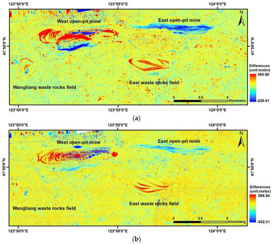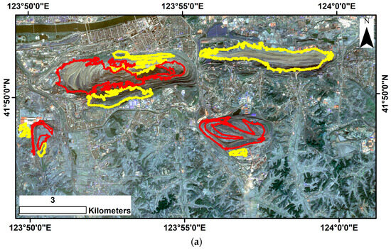 Significant deformed areas are analyzed through extracting the regions with elevations changed and measuring the properties of regions. Using a 95% confidence interval (1.96 times ), districts with obvious elevation changes and an area of deformation over 0.07 km2 are extracted. The results are superimposed on the multispectral image in Figure 8a,b, showing the distribution of significant deformed areas in the two periods, 2012 to 2017, and 2017 to 2022, respectively. Yellow and red polygons draw the boundaries of the districts where the elevations descend and rise significantly, respectively. Deformation in the west open pit, the east open pit and the two dump sites are all obvious but their changes in the two periods, from 2012 to 2017 and 2017 to 2022, are not the same.