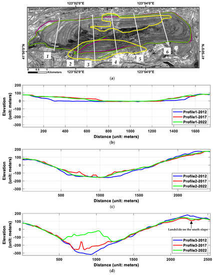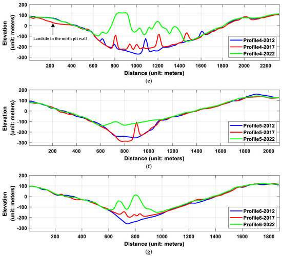 However, Profiles 3~6 show that the bottom of the open pit is lifting from 2017 to 2022, because mining in the west open pit was officially stopped and it is undergoing restoration and post-mining treatment in this period. Furthermore, elevations in the southern part of all five Profiles 2~6 in 2022 are all higher than that in 2017, which means that the landslide (yellow polygon) has been contained.