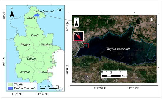 (a) depicts the geographical location of Yuqiao Reservoir, (b) presents a true-color image acquired on 30 May 2022, and (c) displays the northwestern mudflat utilized for historical water level inversion.