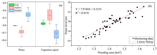 (a) is the multi-index box plot of two features (sample points are selected from ABs with different intensities, AV with different growth states (limited by the spatial resolution of Landsat, AV and ABs cannot be visually distinguished, so the sample points of these two features are mixed) and pure water in different seasons, 250 each); (b) is the linear regression of water level and flooding area.