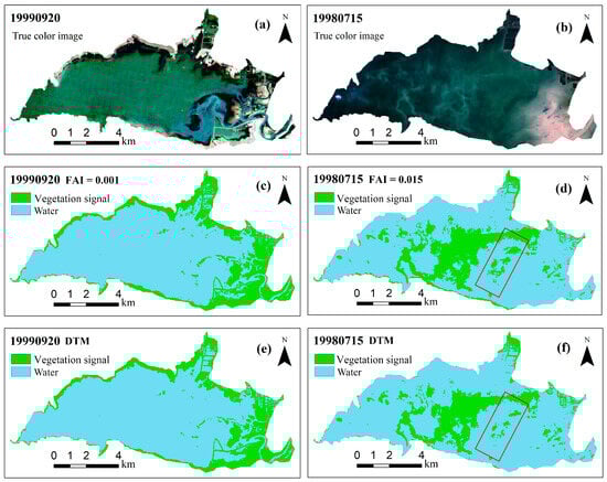 Comparison of the distribution of VS extracted by different methods on 20 September 1999, and 15 July 1998: (a,b) are true color images; (c,d) are VS extracted by FAI with different thresholds; and (e,f) are VS extracted by multi-index DTM.