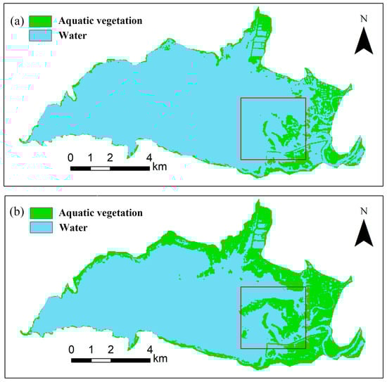 We compared the differences in the interannual maximum range of aquatic vegetation before and after the removal of high water level images, as shown in Figure 5. Figure 5a is the maximum interannual growth range of AV extracted before removing high water level images in 2002; Figure 5b is the AV result after removing high water level images in 2002. If the images of high water level are not excluded, it may lead to a reduction in the maximum growth range of AV and subsequently affect the further extraction of ABs.