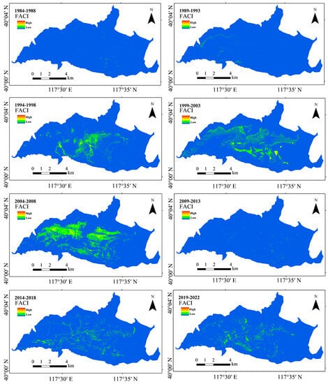 The method was applied to the long-term Landsat images of Yuqiao Reservoir from 1984 to 2022 to investigate the spatial distribution characteristics and temporal variations of ABs. Firstly, the FAI characterizes the intensity of ABs in a single pixel [], which can be used to describe the spatial distribution characteristics of ABs. Secondly, the floating algae coverage index (FACI) is the product of the area of ABs in a single image and the mean value of FAI, which is a comprehensive reflection of AB range and intensity [] and can be used to describe the interannual variation trend of ABs. Finally, considering that no AB event is detected in some years and that the effectiveness of water environmental protection efforts is mostly phased [], the occurrence of ABs in reservoirs is studied statistically in phases, taking five years as a period. The images of the ABs detected in a year are summed and superimposed each year to reflect the frequency and severity of ABs.