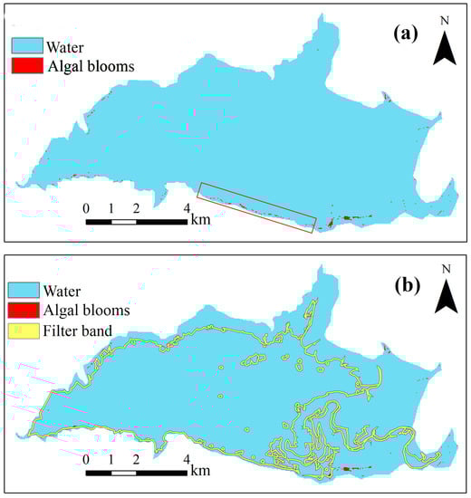 The method of this study is also limited by some factors. There are fewer available images for the extracting of AV extent due to the long revisit period of the Landsat satellite and the poor quality of some images. And the number of images available in some years is small. We use image interpolation technology to supplement the data with images of the same season in adjacent years based on the similarity of plant phenology in the same seasons to realize the continuous monitoring of algal blooms. In addition, the number of available images directly affects the selection of the VPF threshold, which further influences the extraction of the growth range of AV. Moreover, we select 0.5 as the VPF threshold based on the empirical conclusions of other scholars in this study, but the AV of some images is misjudged as ABs which are mostly distributed at the land–water boundary. To address this issue, we propose filtering out misclassified pixels by establishing a buffer zone for the AV boundary (Figure 9). Finally, the selection of VS and water sample points in this study is based on the visual interpretation of the images, which is more subjective. However, standard false-color images typically display VS as red and water as black or blue–black, resulting in a significant color contrast between VS and water. As a result, the probability of error in selecting sample points is relatively small.