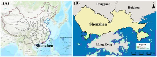 Shenzhen, located in southern China with coordinates of 113°43′~114°38′E and 22°24′~22°52′N, is a key city within the Pearl River Delta urban agglomeration (Figure 1). Its rapid economic and social growth has propelled it to become one of the most vibrant economic hubs in China, with a Gross Domestic Product (GDP) that is superior only to Shanghai and Beijing [27]. According to the seventh national census bulletin, the permanent resident population of Shenzhen is 17,560,100, an increase of 7,136,100 compared to the sixth national census [28].