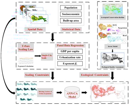 This paper integrates scaling and ecological constraints to model urban spatial expansion (Figure 2) accurately. Initially, we extracted urban impervious areas from spatial data and incorporated statistical data to compute the exponent β for Shenzhen and other representative cities at the individual city scale, a pivotal step in our methodology. Subsequently, we integrated this exponent into the regression model as an adjusted parameter, enabling the accurate and practical prediction of urban land area demand, thereby adhering to the scaling constraint. Concurrently, we employed the Invest model to evaluate ecological quality, establishing the ecological constraint of Shenzhen. Upon obtaining both constraints, this study utilizes the ANN-CA model. This model encompasses both driving factors (determined by transformation probability) and limiting factors that influence urban expansion. The subsequent section outlines the detailed calculation methodologies for each of these procedures.