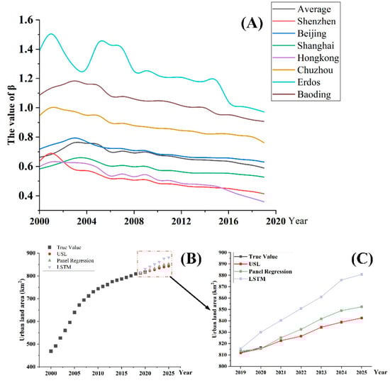 The β value of different cities in China is calculated by urban scaling law at a single-city scale (A) and the predicted urban land demand (B,C) by the USL method (red), panel data regression (green), and LSTM (purple).
