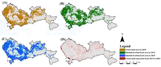 Spatial simulation of urban land expansion in Shenzhen. (A) The real-world urban land area in 2019. (B) Simulated urban land area in 2019. (C) Simulated urban land area in 2025. (D) Predicted urban land expansion from 2019 to 2025.