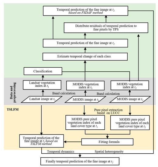 The input data of the TSLFM method consisted of a set of MODIS and Landsat images at time t1, along with a Landsat image at time t2, which were similar to those of the FSDAF method. The output data were predicted as fine-resolution images at time t2. The FSDAF methodology encompassed three key steps that effectively fused remote sensing data Here, we briefly outline the principal processes and relevant equations: