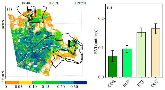 (a) Spatial pattern of the annual average fused EVI of the YRD in 2020. (b) Mean EVI values in different regions of the YRD in 2020. COR = core area, BUF = buffer zone; EXP = experimental area; OUT = outside of the protected area.