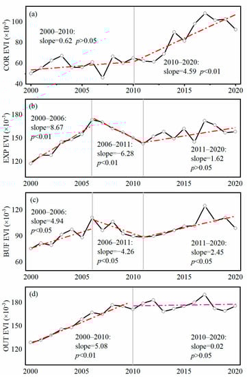 A piecewise linear regression (PLR) model [,] was employed to identify potential EVI trends from 2000 to 2020. The PLR method is a well-known technique used to detecti turning points in time-series data: