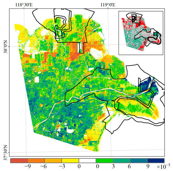 Human activities dominated the vegetation changes outside of the YRDNNR. In recent years, the YRD has experienced a substantial increase in human activities and the expansion of artificial landscapes, and anthropogenic influence has emerged as a primary driver of ecosystem transformations []. Notably, during the 2000s, there was a rapid expansion of agricultural land in the YRD, which was facilitated via effective irrigation management, resulting in a notable increase in the maximum vegetation index during the growing season []. In November 2009, the State Council of the People’s Republic of China approved the “Development Plan for a High-Efficiency Ecological and Economic Zone in the Yellow River Delta,” highlighting the pivotal significance of ecological construction and environmental protection. This development led to a diminishing trend in the expansion of agricultural land, eventually resulting in the reduction in the total farmland area. Meanwhile, the hydrological connectivity in the YRD had a gradually increased in recent years []. Human activities play a significant role in influencing the vegetation dynamics changes in the Yellow River Delta.