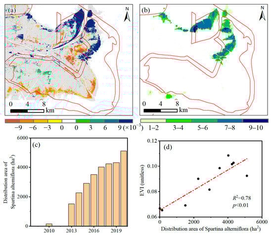 The relationships between the EVIs and Spartina alterniflora distribution core areas of the YRD since 2010. (a) The spatial distribution of significant trends in the annual fused EVI from 2010 to 2020, (b) the distribution frequency of Spartina alterniflora since 2010, (c) the distribution area of Spartina alterniflora since 2010, and (d) the relationships between fused EVI and the distribution area of Spartina alterniflora since 2010.