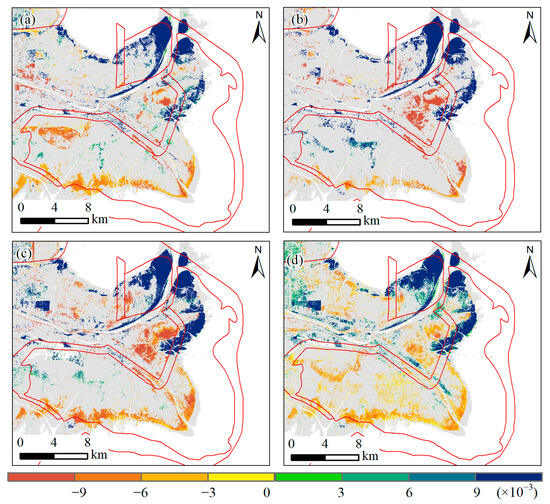 Notable differences in vegetation trends were observed across various regions of the YRD from 2000 to 2020, which were primarily attributable to several distinct driving factors. The invasion of Spartina alterniflora has been identified as the predominant driver behind the significant increasing trend in the EVI of the core area of YRDNNR since 2010. Following its initial appearance in the Yellow River Estuary in 2010, the Spartina alterniflora invasion area has expanded rapidly (Figure 6c). The distribution area of Spartina alterniflora substantially overlapped with the areas of remarkable EVI increase (Figure 6a,b), and the distribution area of Spartina alterniflora explained 78% of the fused EVI variations identified in the core zone (Figure 6d). In different seasons, regions with significant increases in EVI were also highly consistent with areas invaded by Spartina alterniflora (Figure 7).