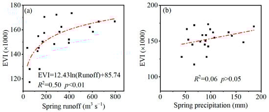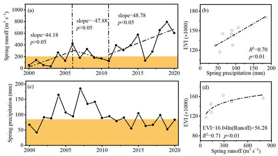 - In the experimental area of YRDNRR, the fused EVI showed a distinct interannual trend characterized by an initial increase (2000–2006, p < 0.01), followed by a subsequent decrease (2006–2011, p < 0.01) and, ultimately, a renewed increase (2011–2020, p > 0.05); the dynamics of fused EVI were mainly affected by the spring runoff (R2 = 0.71), while in years with lower runoff, they was also affected by the spring precipitation (R2 = 0.70).
